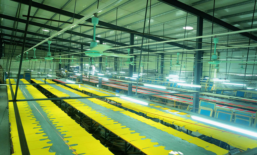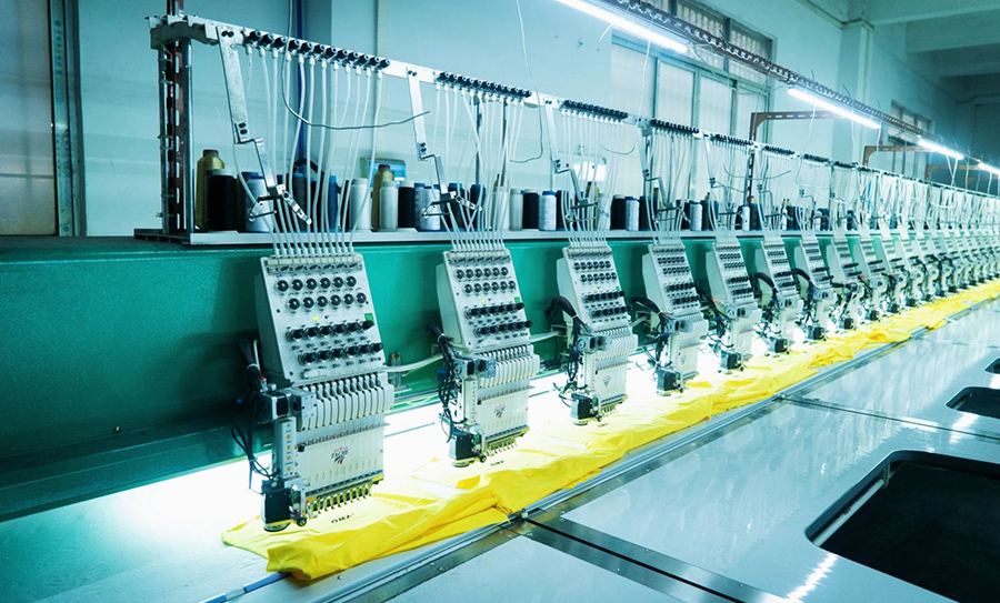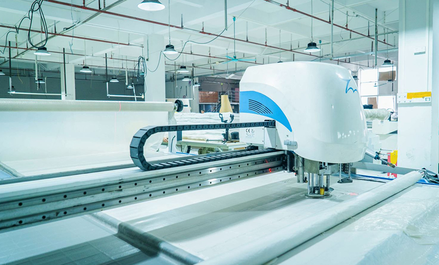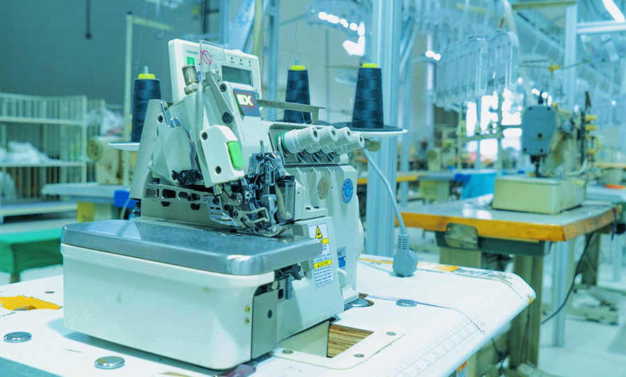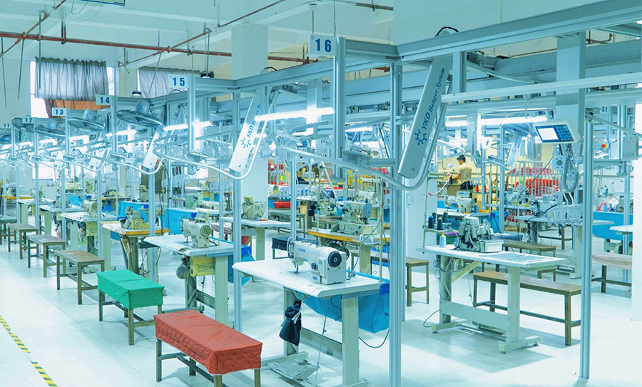 I adopt sewing with The integrated production mode of post integration connects the sewing line with the post-wholeline It is connected by the main rail to realize the streamlined production management mode.